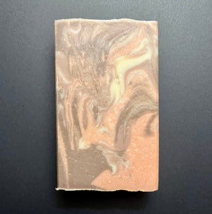 The scent is a mix of sandalwood fragrance with some essential oil (not the endangered one!). The colors are cocoa powder and ethically sourced minerals.